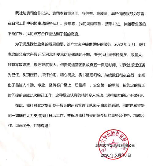 一 北京大學(xué)出版社正式入駐 2020年5月,昌達(dá)集團(tuán)圓滿(mǎn)完成了北京大學(xué)出版社的庫(kù)房搬遷工作,經(jīng)過(guò)緊張有序的搬遷工作,北京大學(xué)出版社正式入駐昌達(dá)集團(tuán)倉(cāng)儲(chǔ)基地,成為昌達(dá)集團(tuán)堅(jiān)實(shí)的合作伙伴。 北大社倉(cāng)儲(chǔ)新庫(kù)房為高層庫(kù)房,地理位置優(yōu)越,交通體系四通八達(dá),整體布局更合理,功能設(shè)置更完善,消防物業(yè)設(shè)施設(shè)備齊全,整體建設(shè)水平領(lǐng)先,大大的滿(mǎn)足了客戶(hù)的倉(cāng)儲(chǔ)需求。 (上圖為北京大學(xué)出版社庫(kù)房效果圖) 5月9日,北京大學(xué)出版社王社長(zhǎng)和孫副社長(zhǎng)一行蒞臨昌達(dá)集團(tuán)考察走訪,對(duì)搬遷入駐后的各項(xiàng)工作進(jìn)行查看,詳細(xì)了解庫(kù)房管理工作以及相關(guān)配套服務(wù)等情況。集團(tuán)相關(guān)部門(mén)負(fù)責(zé)人全程陪同,來(lái)訪領(lǐng)導(dǎo)對(duì)此次搬遷工作和新庫(kù)房給予了高度肯定和認(rèn)可,并就雙方未來(lái)發(fā)展進(jìn)行了深入交流。 5月10日,昌達(dá)集團(tuán)收到北京大學(xué)出版社發(fā)來(lái)的感謝信,對(duì)搬遷期間昌達(dá)集團(tuán)員工的辛勤勞動(dòng)與辛苦付出表示誠(chéng)摯的謝意,并對(duì)昌達(dá)集團(tuán)的服務(wù)工作表示認(rèn)可和好評(píng)。 “以客戶(hù)滿(mǎn)意為目標(biāo)”是昌達(dá)集團(tuán)一直以來(lái)的服務(wù)宗旨,這封感謝信對(duì)昌達(dá)集團(tuán)來(lái)說(shuō)不僅是一種肯定,更是一種鼓勵(lì),激勵(lì)我們?nèi)蘸鬄榭蛻?hù)提供更優(yōu)質(zhì)、更高效的服務(wù)。接下來(lái)雙方將攜手共進(jìn),推動(dòng)全面戰(zhàn)略合作伙伴關(guān)系向縱深發(fā)展,共贏美好未來(lái)! 二 北京理工大學(xué)出版社戰(zhàn)略合作再升級(jí) 2003年,昌達(dá)集團(tuán)與北京理工大學(xué)出版社首次建立運(yùn)輸業(yè)務(wù)合作,2012年升級(jí)為倉(cāng)儲(chǔ)+運(yùn)輸業(yè)務(wù)合作,多年來(lái),集團(tuán)以?xún)?yōu)質(zhì)的服務(wù)和良好的口碑切切實(shí)實(shí)獲得了客戶(hù)的連續(xù)好評(píng)。 隨著集團(tuán)業(yè)務(wù)的深入發(fā)展,全面托管業(yè)務(wù)逐漸成為公司的重點(diǎn)發(fā)展業(yè)務(wù)。昌達(dá)集團(tuán)從前期的協(xié)調(diào)溝通、資料準(zhǔn)備、細(xì)節(jié)把控到后期的合作達(dá)成,每個(gè)工作環(huán)節(jié),均表現(xiàn)出超強(qiáng)的企業(yè)實(shí)力和專(zhuān)業(yè)能力,最終以?xún)?yōu)質(zhì)服務(wù)贏得了客戶(hù)的肯定和認(rèn)可。今年3月份,昌達(dá)集團(tuán)與北京理工大學(xué)出版社就托管業(yè)務(wù)達(dá)成了戰(zhàn)略合作協(xié)議。 自達(dá)成戰(zhàn)略合作后,昌達(dá)集團(tuán)斥重資打造現(xiàn)代化高位一體貨倉(cāng),各類(lèi)圖書(shū)按照品類(lèi)整體重新規(guī)劃,合理安排庫(kù)房面積,引入自主研發(fā)的倉(cāng)儲(chǔ)物流系統(tǒng),并將之前傳統(tǒng)紙質(zhì)版揀配轉(zhuǎn)換成現(xiàn)代化的PDA掃描揀配,全程可視,快速準(zhǔn)確,在提高工作效率的同時(shí),也極大地調(diào)動(dòng)了員工的積極性。 (上圖為北京理工大學(xué)出版社領(lǐng)導(dǎo)參觀) 5月8日,理工出版社叢社長(zhǎng)和徐副社長(zhǎng)蒞臨昌達(dá)集團(tuán)考察走訪,在相關(guān)部門(mén)領(lǐng)導(dǎo)的引導(dǎo)下對(duì)托管庫(kù)房圖書(shū)擺放及退發(fā)貨等流程進(jìn)行了細(xì)致的參觀。各位來(lái)訪領(lǐng)導(dǎo)對(duì)托管庫(kù)房的規(guī)劃、布局表示肯定,對(duì)昌達(dá)集團(tuán)的工作表示高度認(rèn)可,未來(lái)雙方將依托全面戰(zhàn)略合作關(guān)系,實(shí)現(xiàn)互利共贏,共同發(fā)展的目標(biāo)。 5月,對(duì)于昌達(dá)集團(tuán)來(lái)說(shuō)是意義非凡的一月,多家客戶(hù)的入駐和業(yè)務(wù)升級(jí),將會(huì)推動(dòng)昌達(dá)集團(tuán)倉(cāng)儲(chǔ)物流業(yè)務(wù)進(jìn)一步走向精細(xì)化經(jīng)營(yíng)管理,加速集團(tuán)資源整合,助力產(chǎn)業(yè)升級(jí)新發(fā)展。 前景廣闊,催人奮進(jìn)。昌達(dá)集團(tuán)成立20余年,初心不改,矢志不渝,始終秉承“以客戶(hù)滿(mǎn)意為目標(biāo)”的服務(wù)宗旨,精益求精、一絲不茍地做好各項(xiàng)工作。昌達(dá)集團(tuán)的快速發(fā)展離不開(kāi)各位客戶(hù)的支持與信任,未來(lái),昌達(dá)集團(tuán)將不忘初心,篤定前行,為客戶(hù)提供更專(zhuān)業(yè)、更高效的服務(wù),打造京津冀地區(qū)最值得信賴(lài)的圖書(shū)供應(yīng)鏈合作伙伴,樹(shù)企業(yè)典型,做行業(yè)典范。