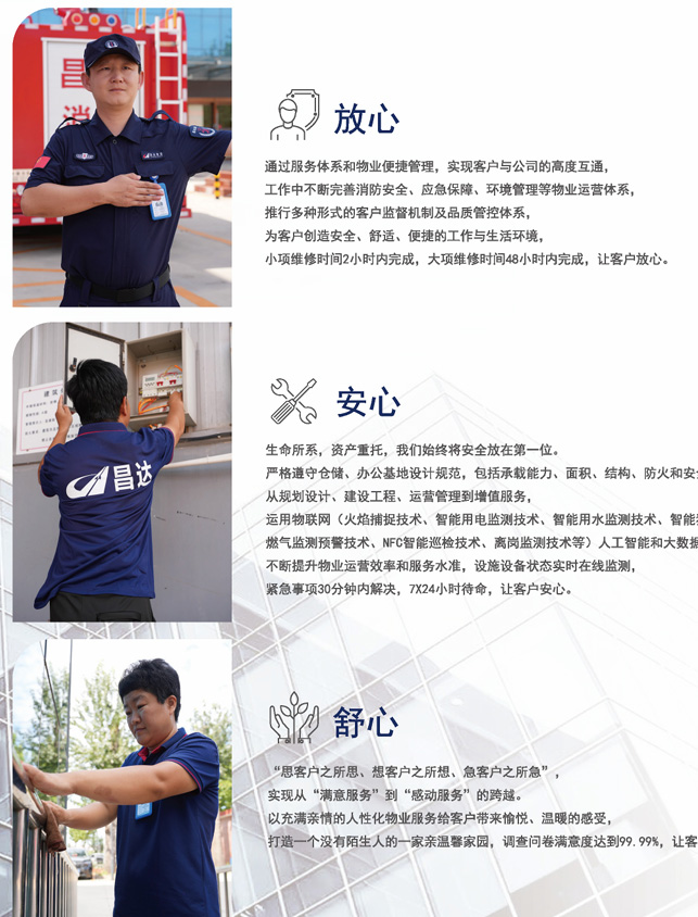 通過服務(wù)體系和物業(yè)便捷管理,實(shí)現(xiàn)客戶與公司的高度互通,工作中不斷完善消防安全、應(yīng)急保障、環(huán)境管理等物業(yè)運(yùn)營(yíng)體系,推行多種形式的客戶監(jiān)督機(jī)制及品質(zhì)管控體系,為客戶創(chuàng)造安全、舒適、便捷的工作與生活環(huán)境,小項(xiàng)維修時(shí)間2小時(shí)內(nèi)完成,大項(xiàng)維修時(shí)間48小時(shí)內(nèi)完成,讓客戶放心。